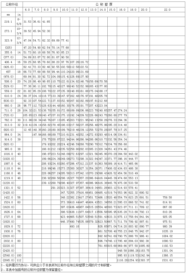 螺旋鋼管公稱外徑、公稱壁厚和單位長度重量